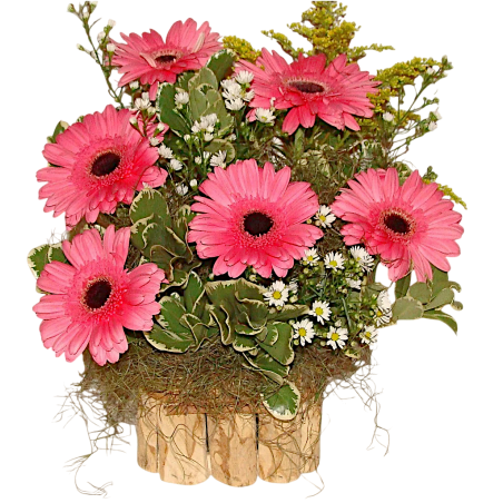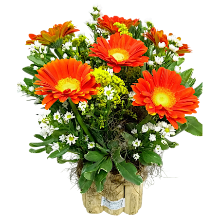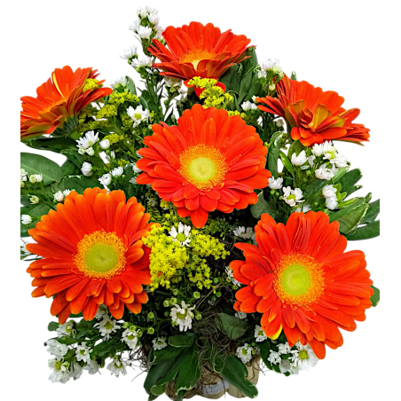Arranjo no cachepot com 6 gerberas, tango, áster e folhagens. Várias cores disponíveis