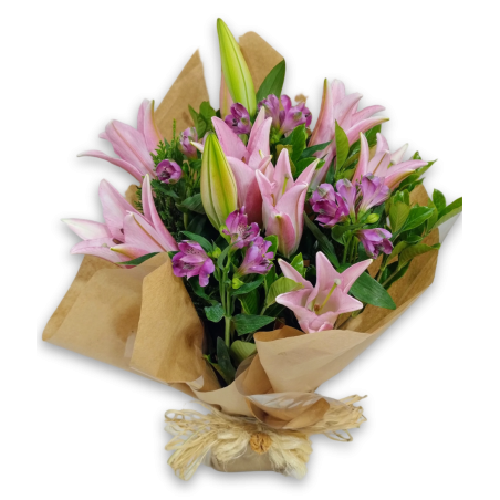 Arranjo com 4 hastes de lírio, astromélia e folhagens. Acabamento em papel kraft.