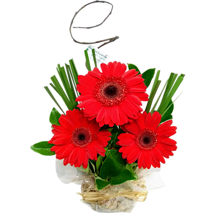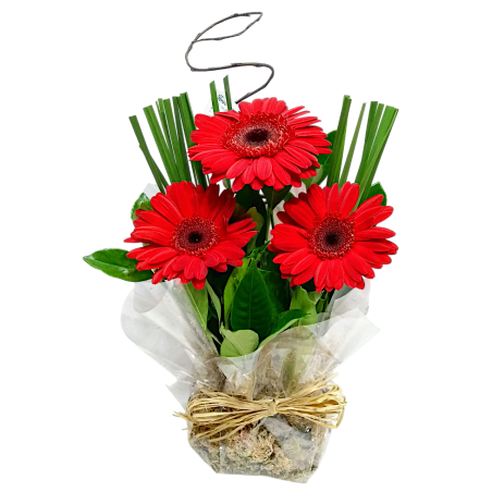 Arranjo com 3 gérberas e folhagens, acabamento com musgo.