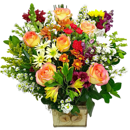 Arranjo com 6 rosas, flores do campo, tango, áster, astromélias e folhagens.