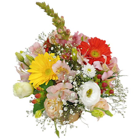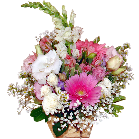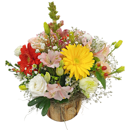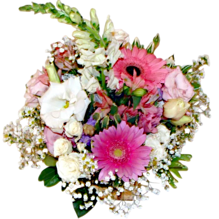 Arranjo com flores diversas, gérberas, liziantus, boca de leão aster, gipsofila, folhagens e margaridas