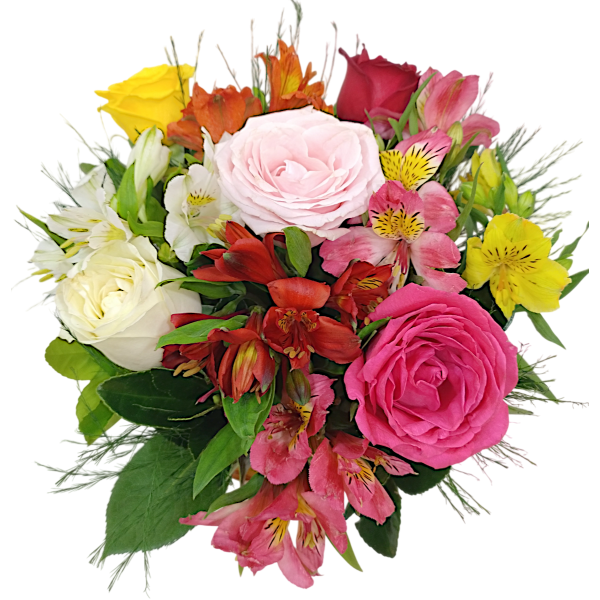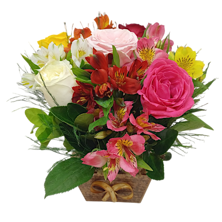 Arranjo no cachepot com 5 rosas e astromélias coloridas.