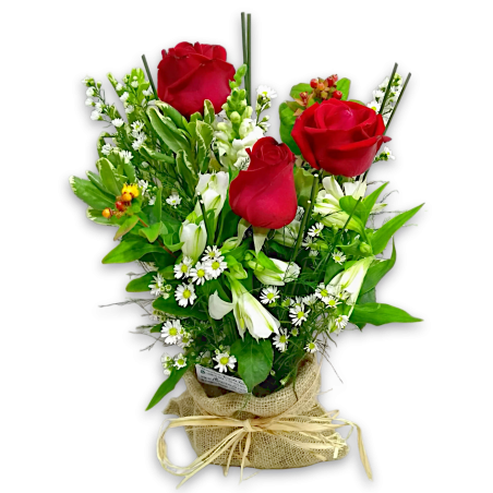 Arranjo na juta com 3 rosas, áster, astromélia, boca de leão e folhagens