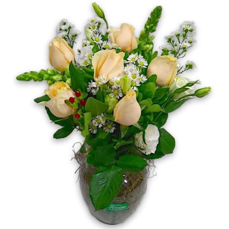 Arranjo no vidro com 6 rosas, áster, tango, astromélias ou boca de leão e folhagens