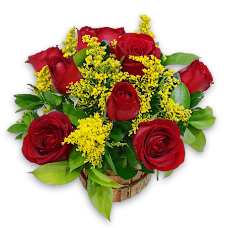 Arranjo no cachepot com 9 rosas, tango e folhagens.