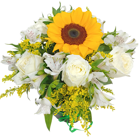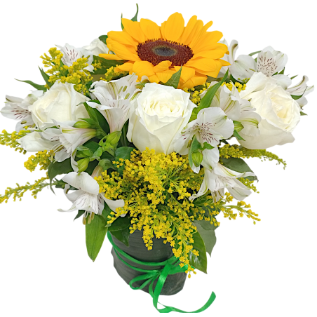 Arranjo composto por girassol, 5 rosas, 5 astromélias, tango e folhagens. Acompanha vidro com acabamento em dracena.