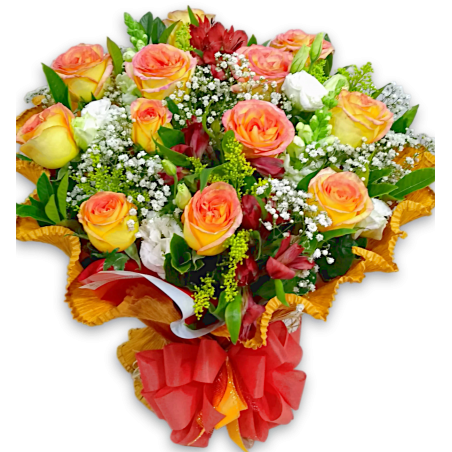 Arranjo com 12 rosas, acompanhado de áster, astromélias ou boca de leão, tango e folhagens, envolvidos em papel crepom.