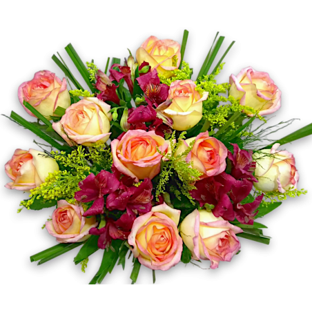 Arranjo no vidro com 12 rosas, áster, tango, astromélias ou boca de leão e folhagens