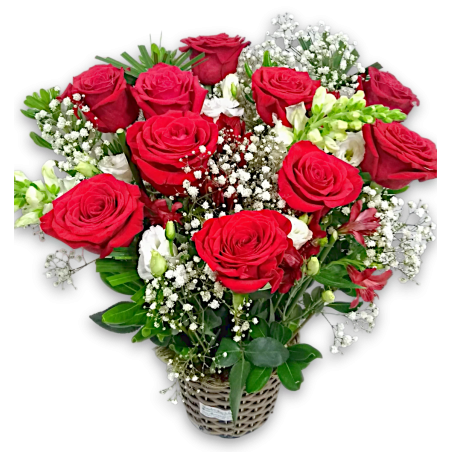 Arranjo no cachepot sintético com 10 rosas colombianas, astromélia, boca de leão, gipsofila e folhagens - 3195