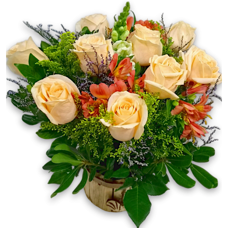 Arranjo com 9 rosas, tango, áster, limonium, astromélias e folhagens, no cachepot de P11.