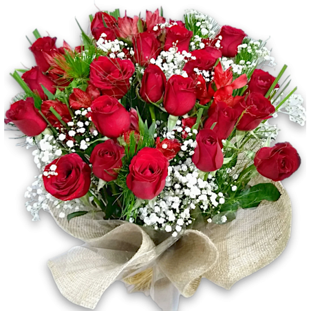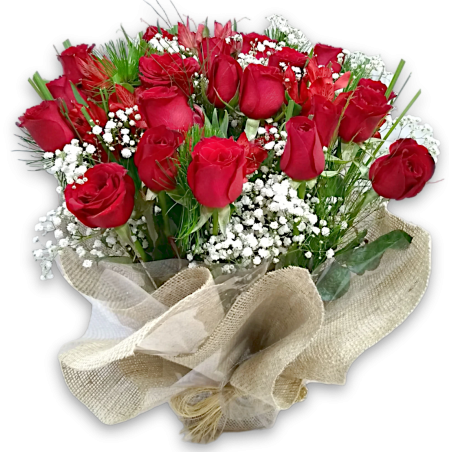 Arranjo com 24 rosas na juta natural acompanhado de astromélias, folhagens e limonium ou gipsofila.