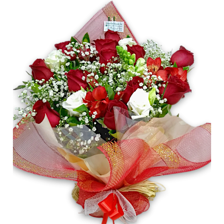Arranjo na juta sintética com 12 rosas, gipsofila e folhagens.