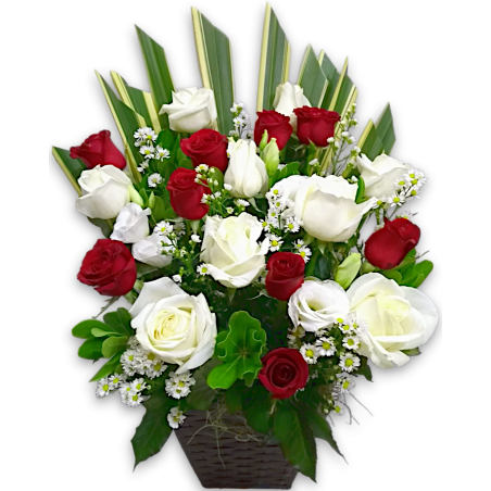 Arranjo com 18 rosas, áster, lisiantus e folhagens.