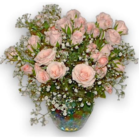 Arranjo no vidro com rosa spray, gipsofila, folhagens e vidro com gel bolinha