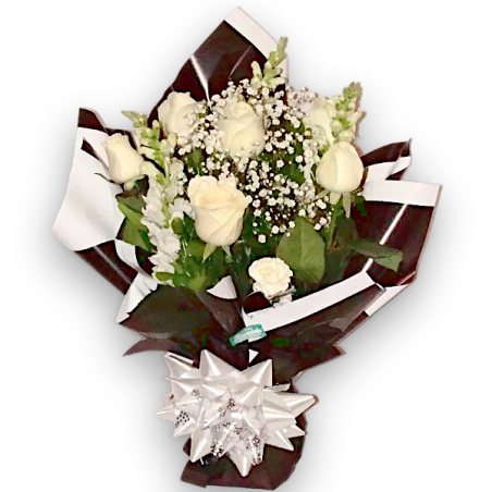 Lindo arranjo com 6 rosas, boca de leão, astromélias ou cravinías acompanhado de folhagens, em papel branco e preto com laço exclusivo.