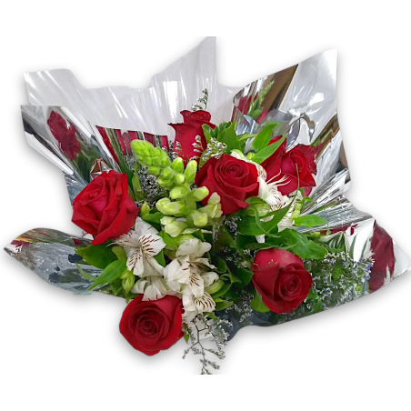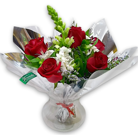 Lindo arranjo com vaso de vidro com 6 rosas.