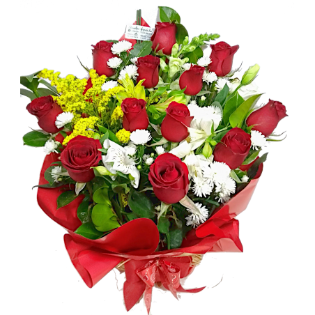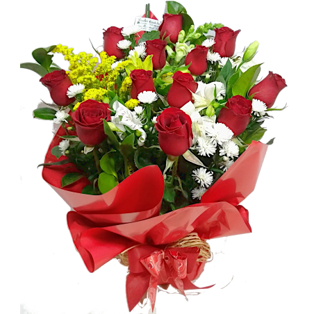 Arranjo no celofane com 12 rosas, áster, tango, astromélias ou boca de leão, flores miúdas da época e folhagens