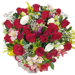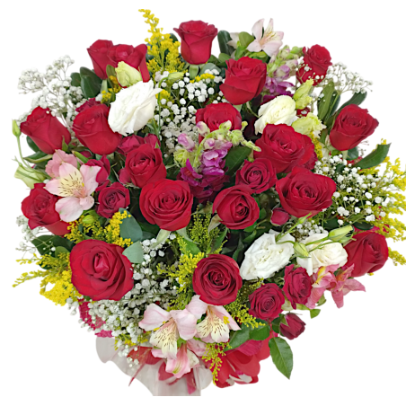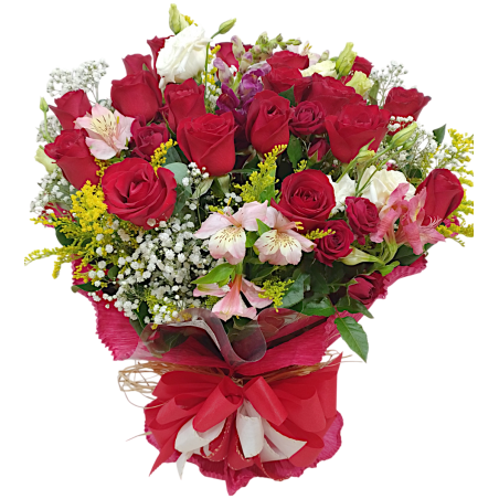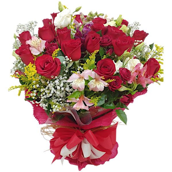 Arranjo com 18 rosas, acompanhado de áster, astromélias ou boca de leão, tango e folhagens, envolvidos em papel crepom.