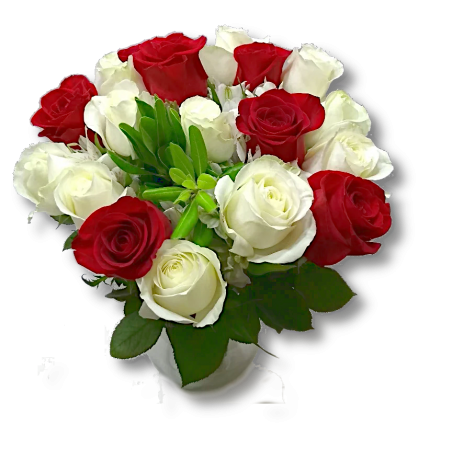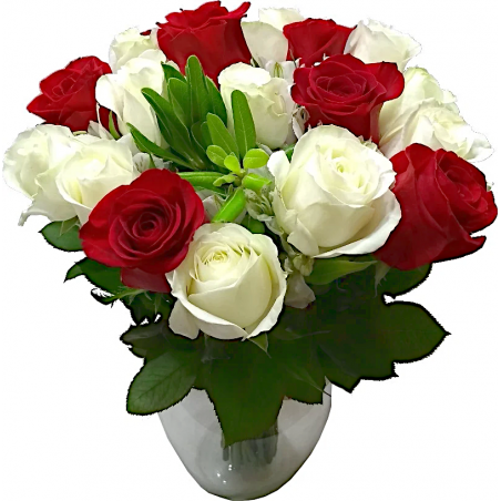 Arranjo com 18 rosas e folhagens no vaso vidro