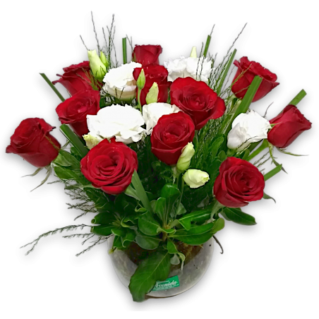 Arranjo com 12 rosas no vidro aquário com musgo