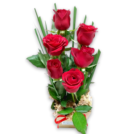 Arranjo no cachepot com 6 rosas, folhagens e acabamento com musgo.