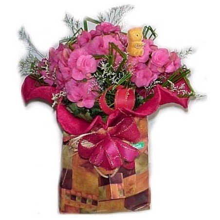 Este arranjo acompanha vaso de flores que pode ser cultivada ou replantada.