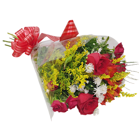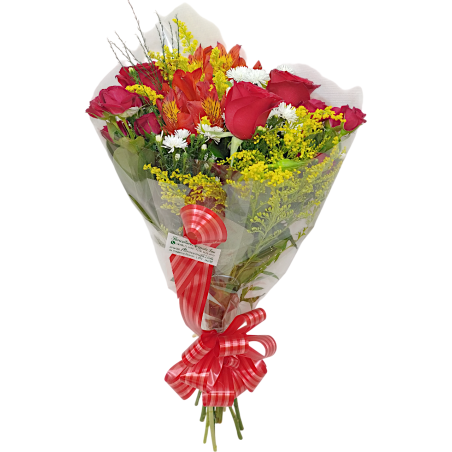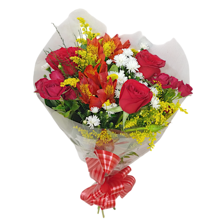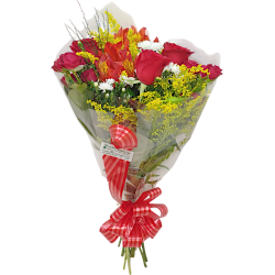 Buquê com 3 rosas, tango, áster, astromélia e folhagens.