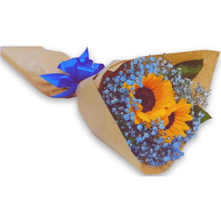 Buquê com 2 girassóis e gipsofila azul (tingida). Acamento em kraft com laço em cetim.