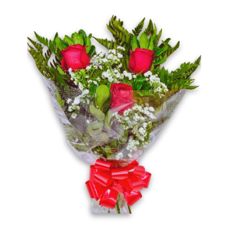 Ramalhete com 3 rosas, acompanhado de áster, tango e folhagens.