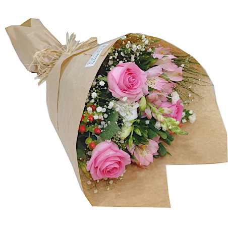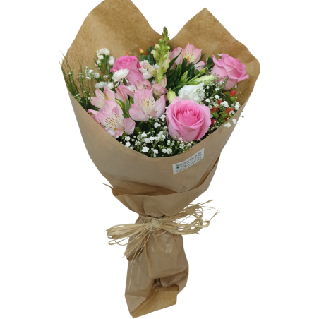 Buquê com 3 rosas, boca de leão, astromélia, gipsofila e folhagens. Acamento em papel kraft e ráfia.