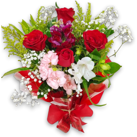 Arranjo com 4 rosas, boca de leão, astromélia, tango, áster e folhagens.