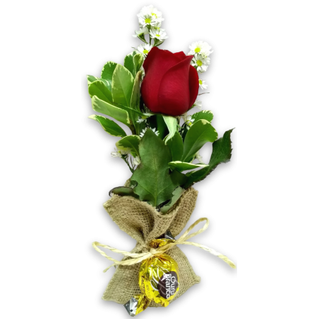 Botão de rosa com áster e folhagens na juta com bombom.