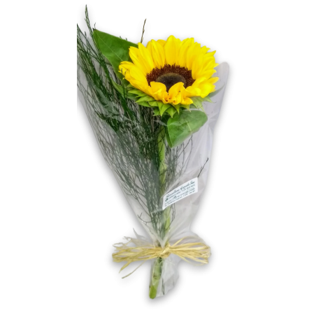 Girassol embalado no celofane com aspargo e acabamento com ráfia