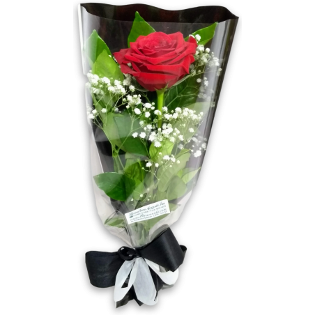 Composição: Botão de rosa importada com gipsofila ou áster e folhagem no tubo de celofane.