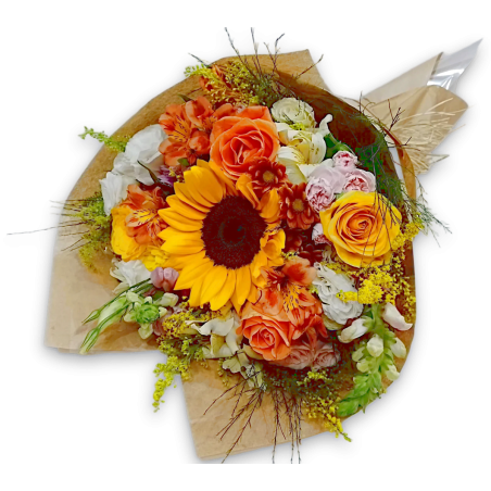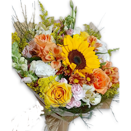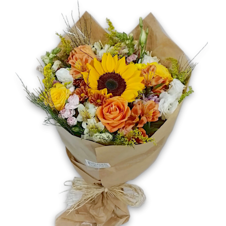Composição: girassol, rosa, astromélia, margarida, cravo spray, lisianthus, boca de leão entre outras. A coloração e tipos de flores podem sofrer alterações conforme o estoque.