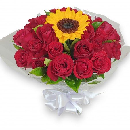 Buquê com 1 girassol e 24 rosas. Laço em cetim.