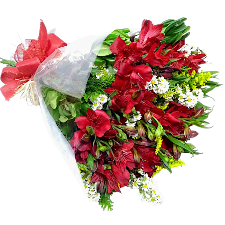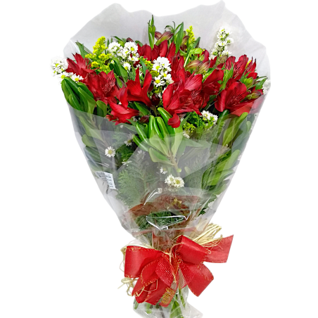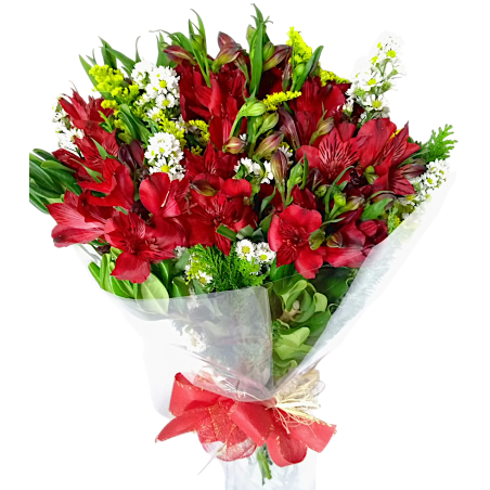 Buquê com 10 hastes de astromélia, áster, tango e folhagens.