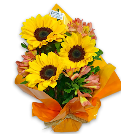 Arranjo no floral com 3 girassóis, áster e folhagens.