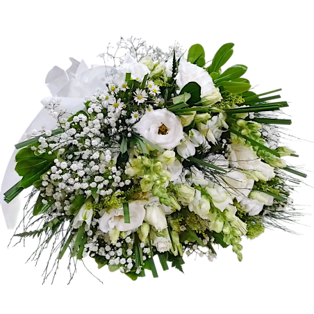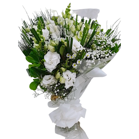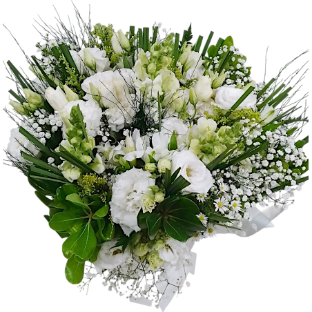 Buquê redondo liziantus, acompanhado de áster, astromélias ou boca de leão, tango e folhagens.