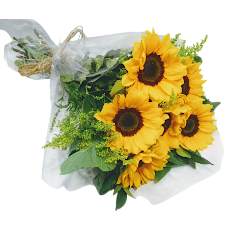 Buquê com 6 girassóis, tango e folhagens.