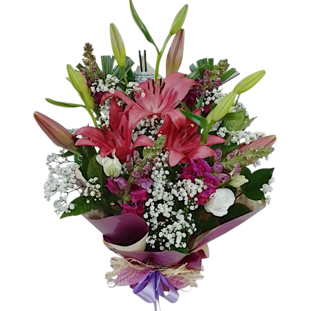 Arranjo floral com lírios, boca de leão, lisianthus, gipsofila e folhagens.