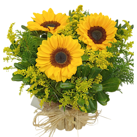 Arranjo com 3 girassóis, tango e folhagens no cachepot P11 rústico.