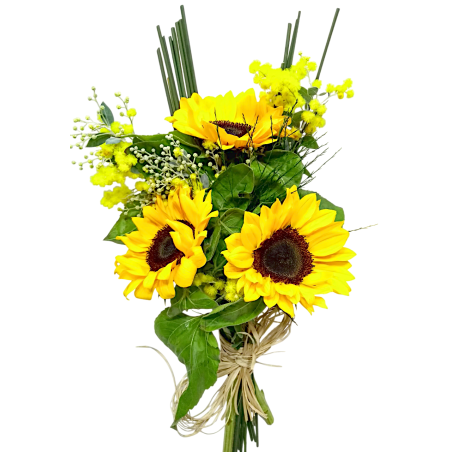 Buquê com 3 girassóis, tango, junco e folhagens.