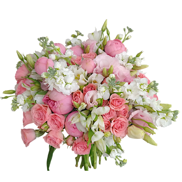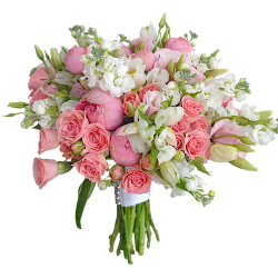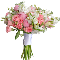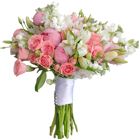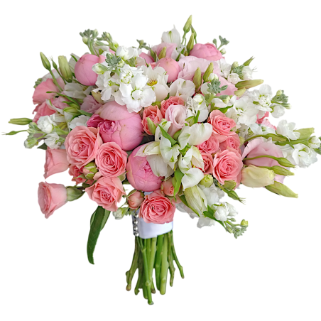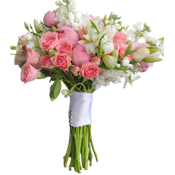 Buquê de noiva composto por rosa spray, astromélia, goivo (sujeito a substituição por boca de leão conforme a época do ano), lisianthus e rosa inglesa. Acabamento em cetim com strass.