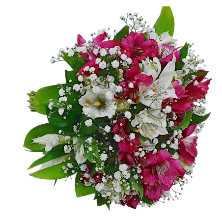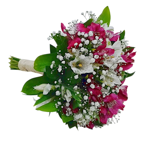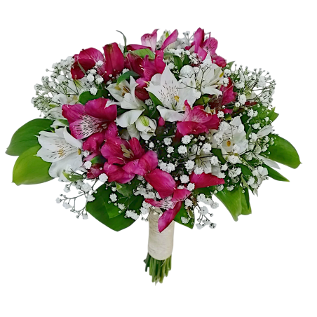 Buquê de noiva com 20 hastes de astromélias, gipsofila e ruscus. Acabamento em cisal - 1373