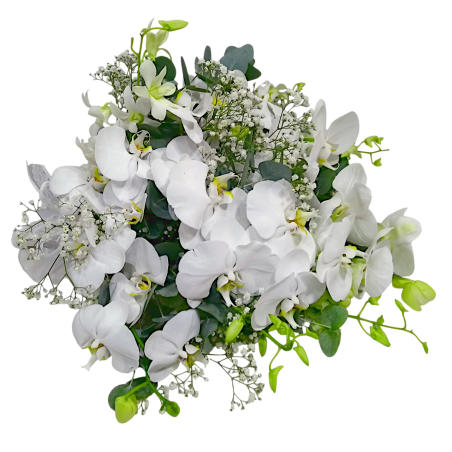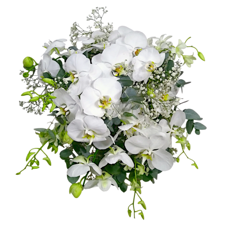 Buque de noiva com orquídea phalaenopsis, denphale, gipsofila e eucalipto.
