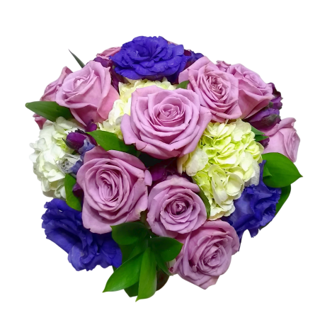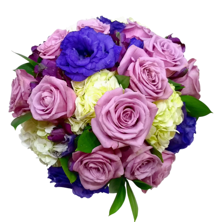 Buquê de noiva com 12 rosas, lisiantus, astromélia, hortência e folhagens.