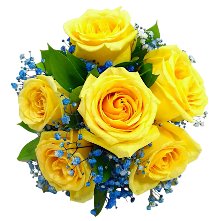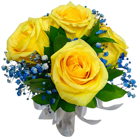 Buque de noiva com 6 rosas colombianas, gipsofila e folhagens. Cabo revestido em cetim branco.