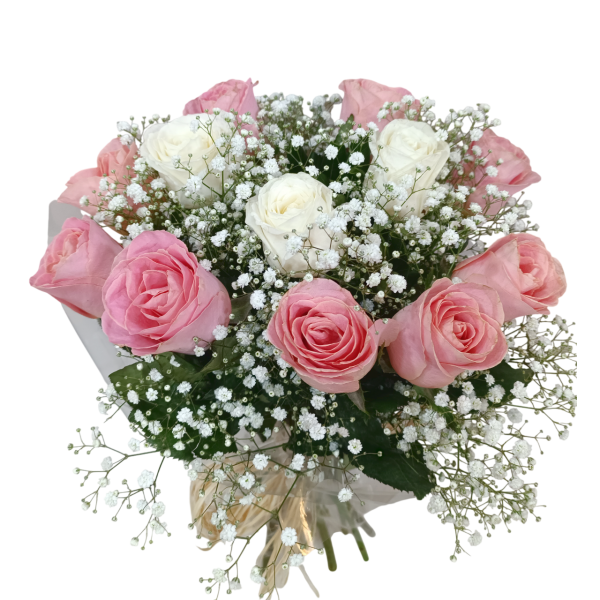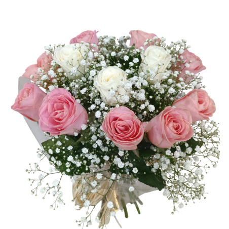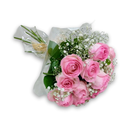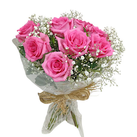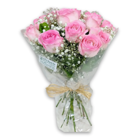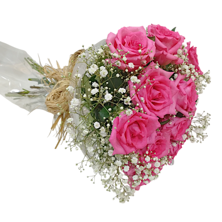 Buquê redondo compacto com 12 rosas, gipsofila e folhagens. Acabamento em ráfia.