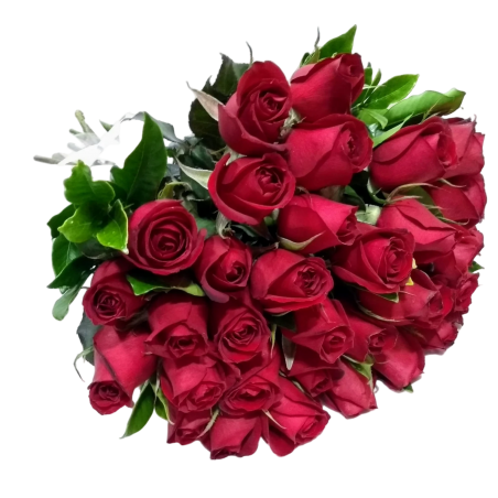 Buquê redondo com 36 rosas e folhagens.